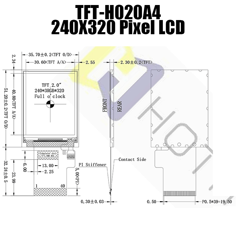 Product Description TFT-H020A4QVIST6N40 is a 2.0-inch full-color TFT LCD module with a resolution of 240x320 pixels and an aspect ratio of 3:4. The TFT module adopts ST7789V driver IC and supports MCU interface. The TFT module with IPS panel has the advantage of wide viewing angle (left 80 degrees/right 80 degrees/up 80 degrees/down 80 degrees), typical contrast ratio is 800:1, and module brightness is up to 600 nits (typical value). The operating temperature range of the module is -30℃~+85℃, and the storage temperature range is -30℃~+85℃.