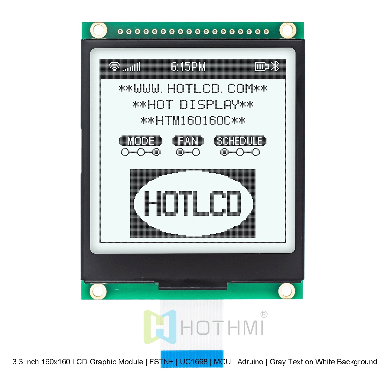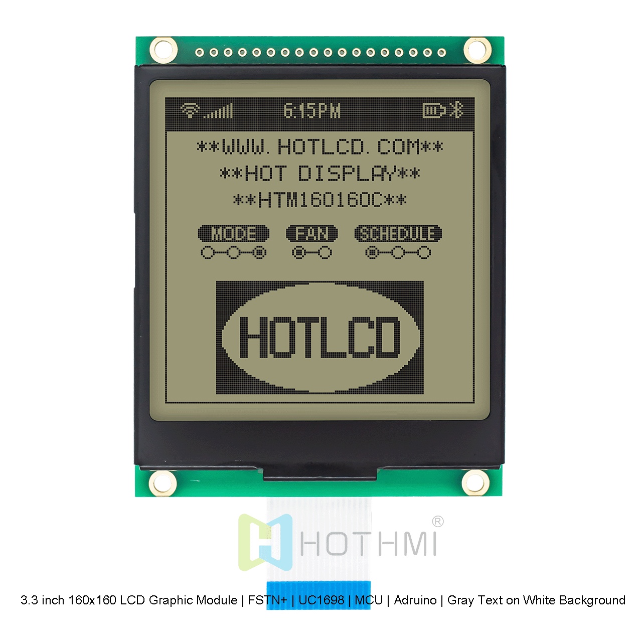 3.3 英寸 160x160 LCD 圖形模塊在白色背景上顯示深灰像素。這款透射式 LCD 顯示屏經(jīng)過(guò)精心設(shè)計(jì),可在較暗的環(huán)境下使用時(shí)提供最佳的可視性和令人印象深刻的色彩。顯示屏內(nèi)置強(qiáng)背光,可提供高對(duì)比度并確保屏幕上所有圖形的易讀性。