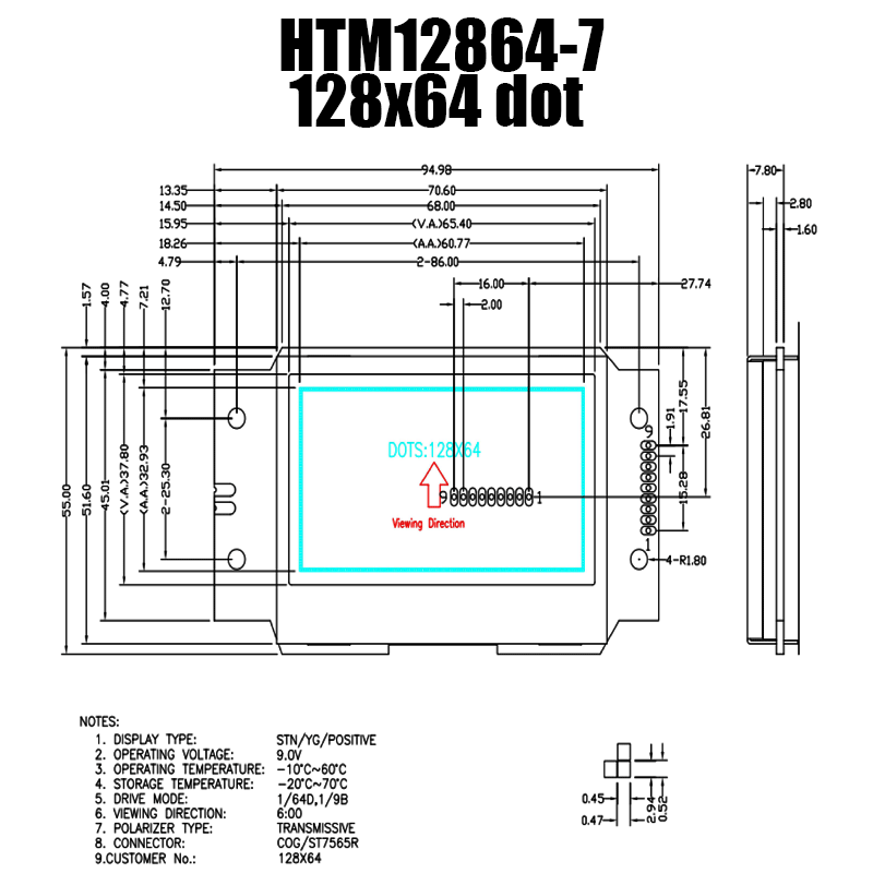 • 型號: 128x64 點(diǎn)陣液晶模組/HTM12864-7
