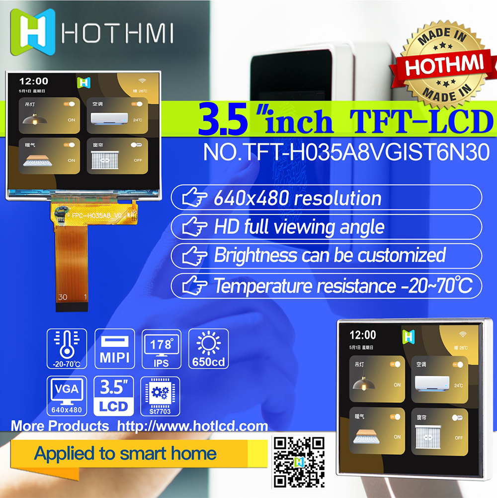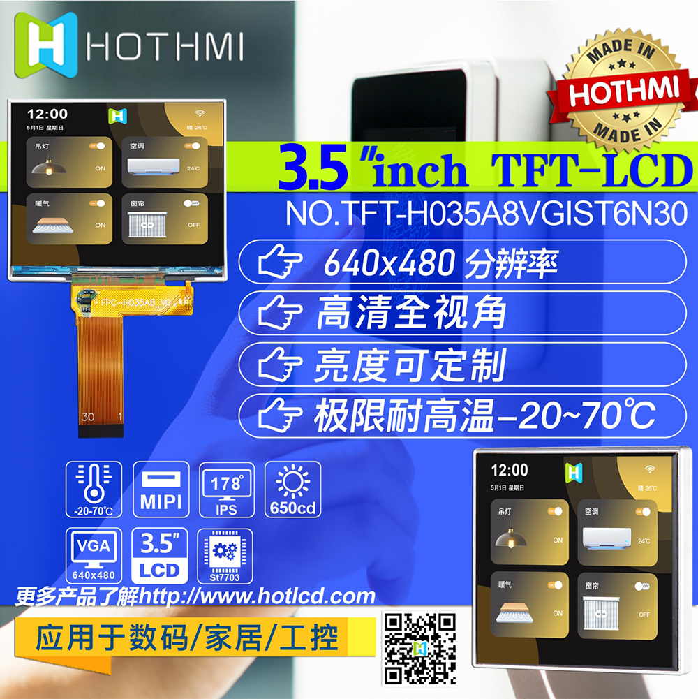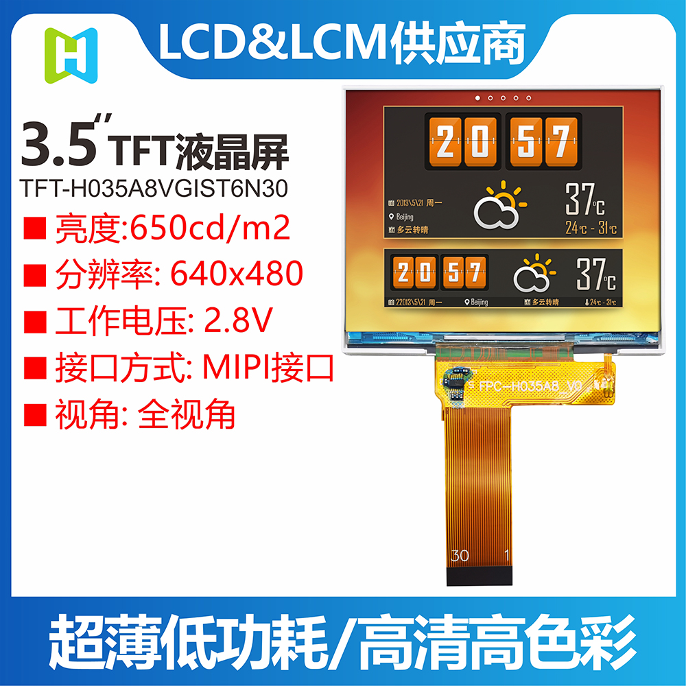 產(chǎn)品說明 TFT-H035A8VGIST6N30 是一款 3.5 英寸全彩 TFT LCD 模塊,分辨率為 640x480 像素,縱橫比為 1.25:1。 TFT模塊采用ST7703驅(qū)動(dòng)IC,支持MIPI接口。 采用IPS面板的TFT模組具有廣視角優(yōu)勢(左80度/右80度/上80度/下80度),典型對(duì)比度800:1,模組亮度高達(dá)650尼特 (典型值)。 模塊工作溫度范圍-20℃~+70℃,儲(chǔ)存溫度范圍-30℃~+80℃。