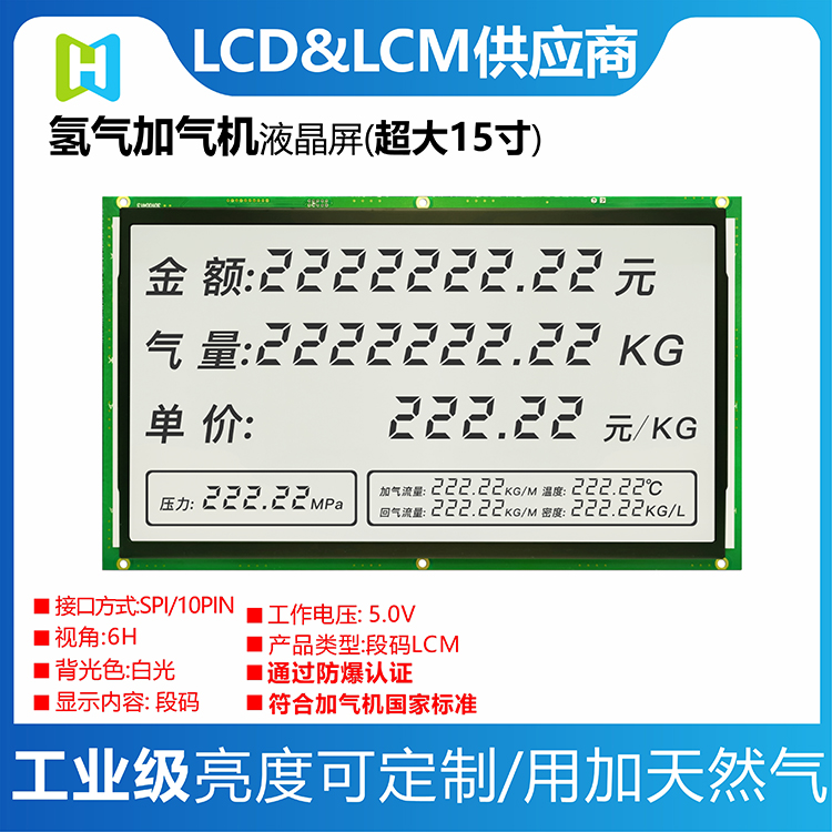鑫洪泰HOTLCD專(zhuān)為加氣機(jī)研發(fā)了一款15寸大型段碼液晶顯示屏,這款屏不僅可以通過(guò)防爆認(rèn)證還可根據(jù)客戶(hù)需求定制任意結(jié)構(gòu)尺寸以及顯示內(nèi)容