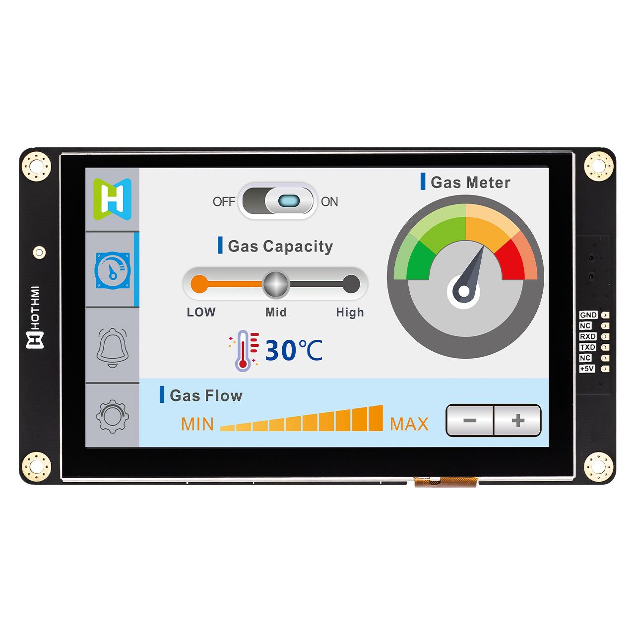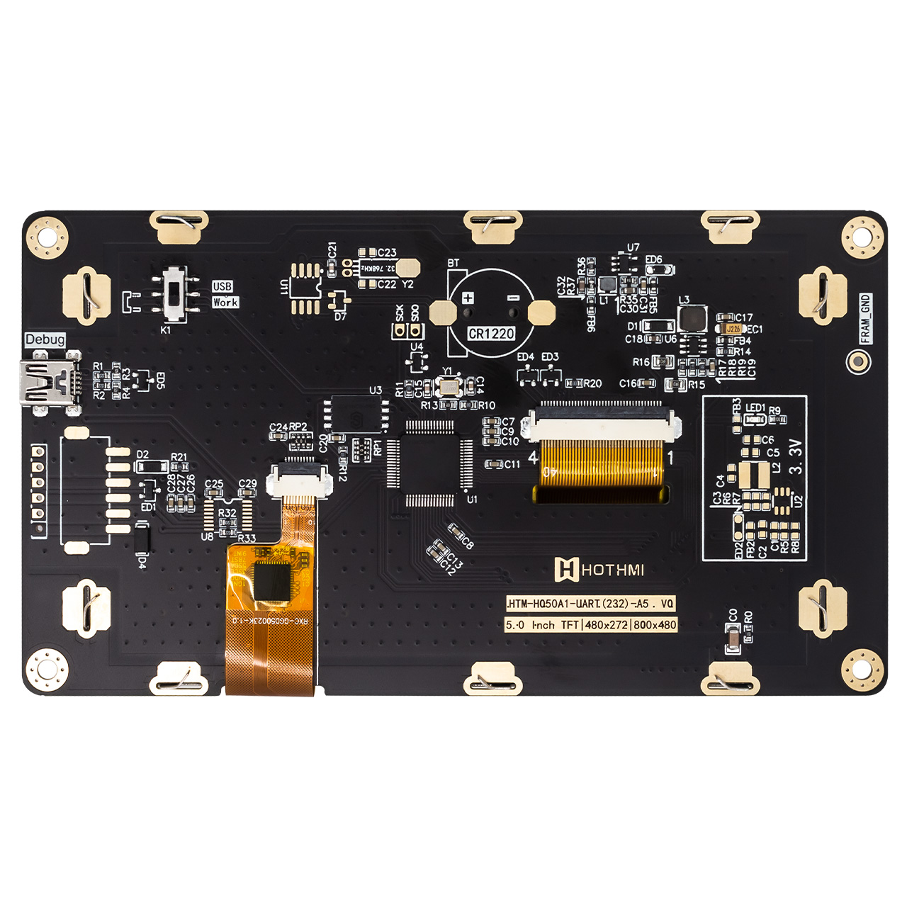 HTM-H050A1-UART-A5C是一款 5.0英寸 IPS TFT 顯示模組,分辨率為 800x480 像素。它是一款帶有智能顯示功能的顯示屏,有UART接口,人機信息交換功能。除了控制器之外,我們的 HMI 顯示器還集成了 MCU 功能。MCU 通過 UART 接口接收主控制板(客戶端)發(fā)送的命令,然后根據這些預定義的指令顯示文本、圖像或動畫。主控制板(客戶端)上的 MCU 不需要專門針對圖像顯示的復雜編程或執(zhí)行。您可以使用我們的 GUI 設計軟件 - UI 編輯器輕松創(chuàng)建文本、圖像或動畫。無需編程技能。這款型號同時配置了電容式觸摸,多點觸控,順暢無阻。